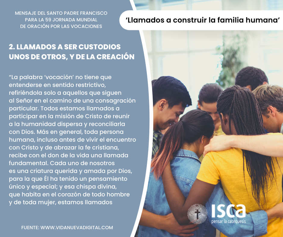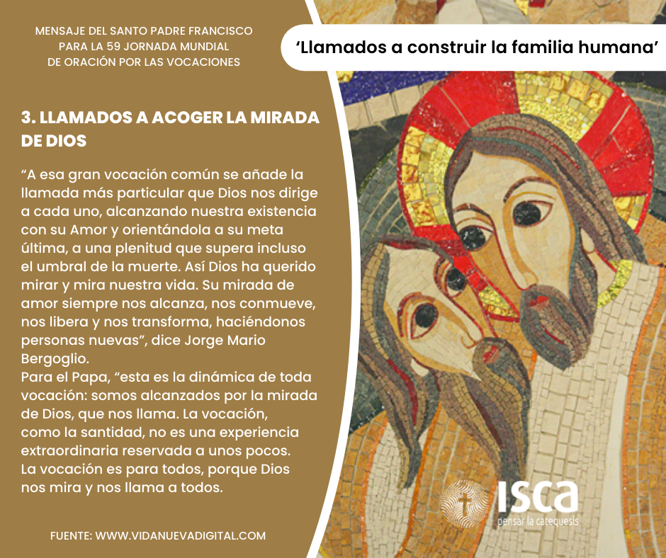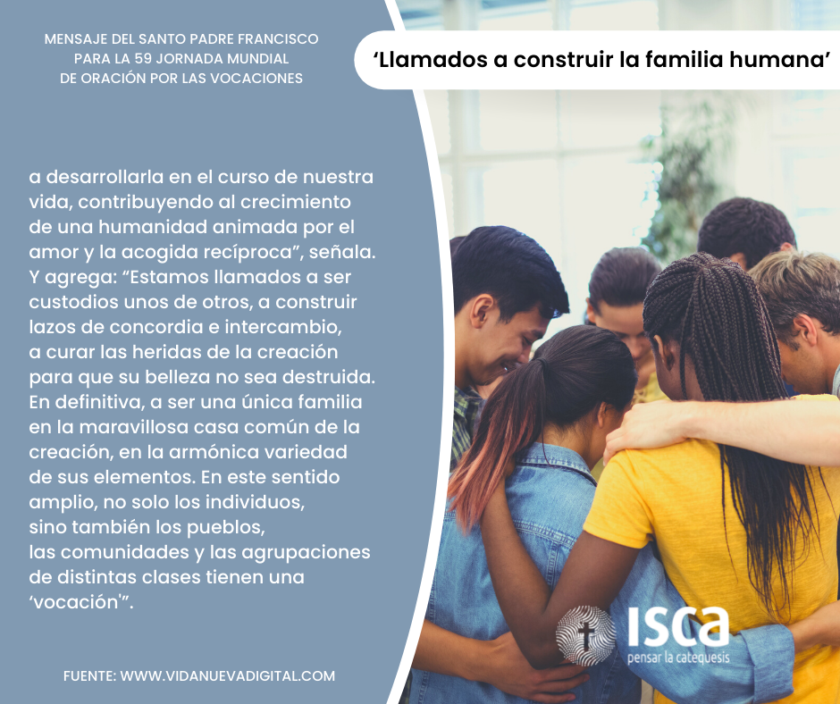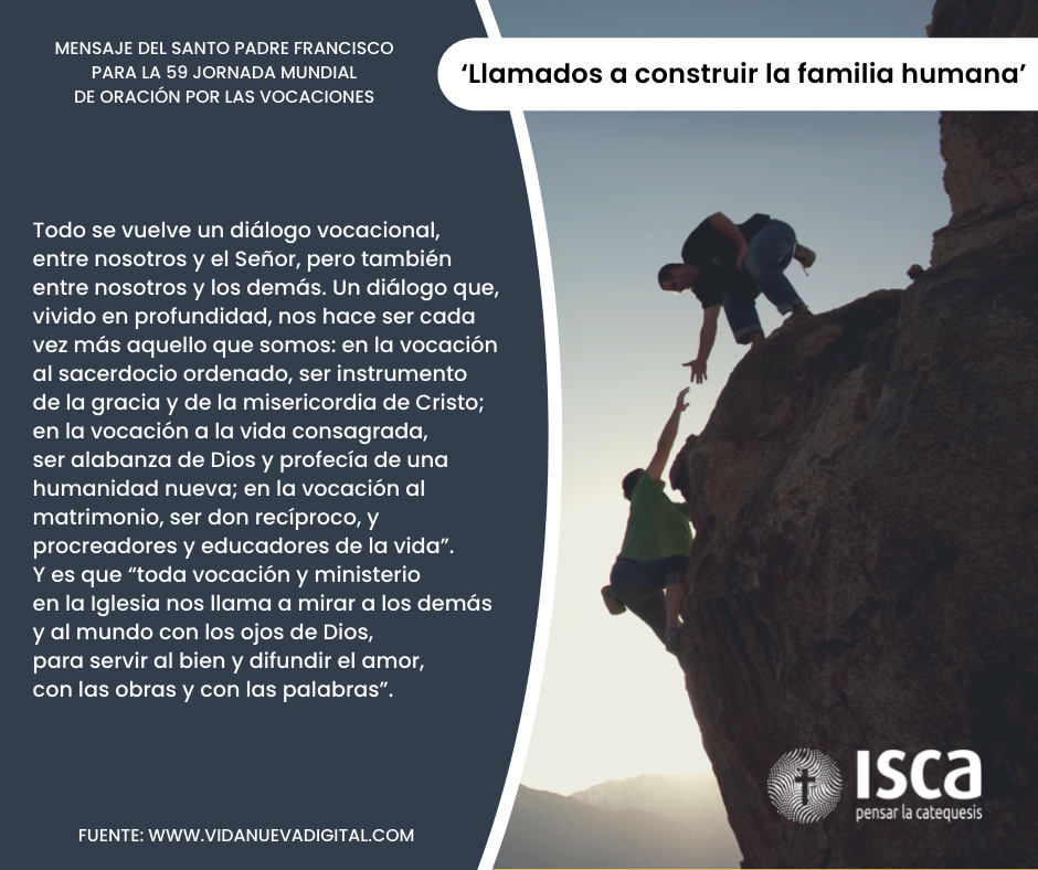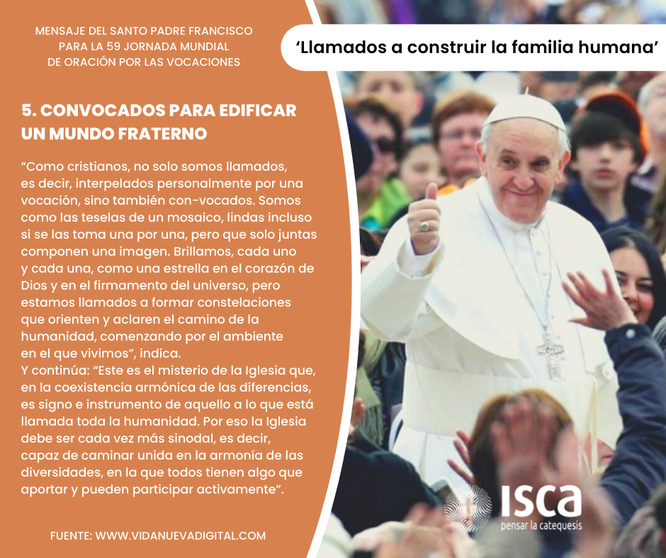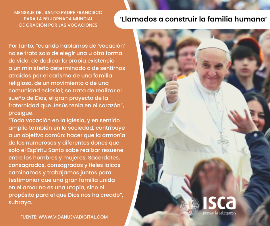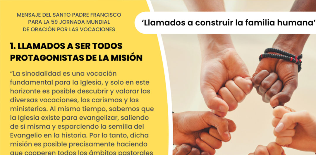 Para la 59ª Jornada Mundial de Oración por las Vocaciones, deseo reflexionar con ustedes sobre el amplio significado de la “vocación”, en el contexto de una Iglesia sinodal que se pone a la escucha de Dios y del mundo. Papa Francisco.