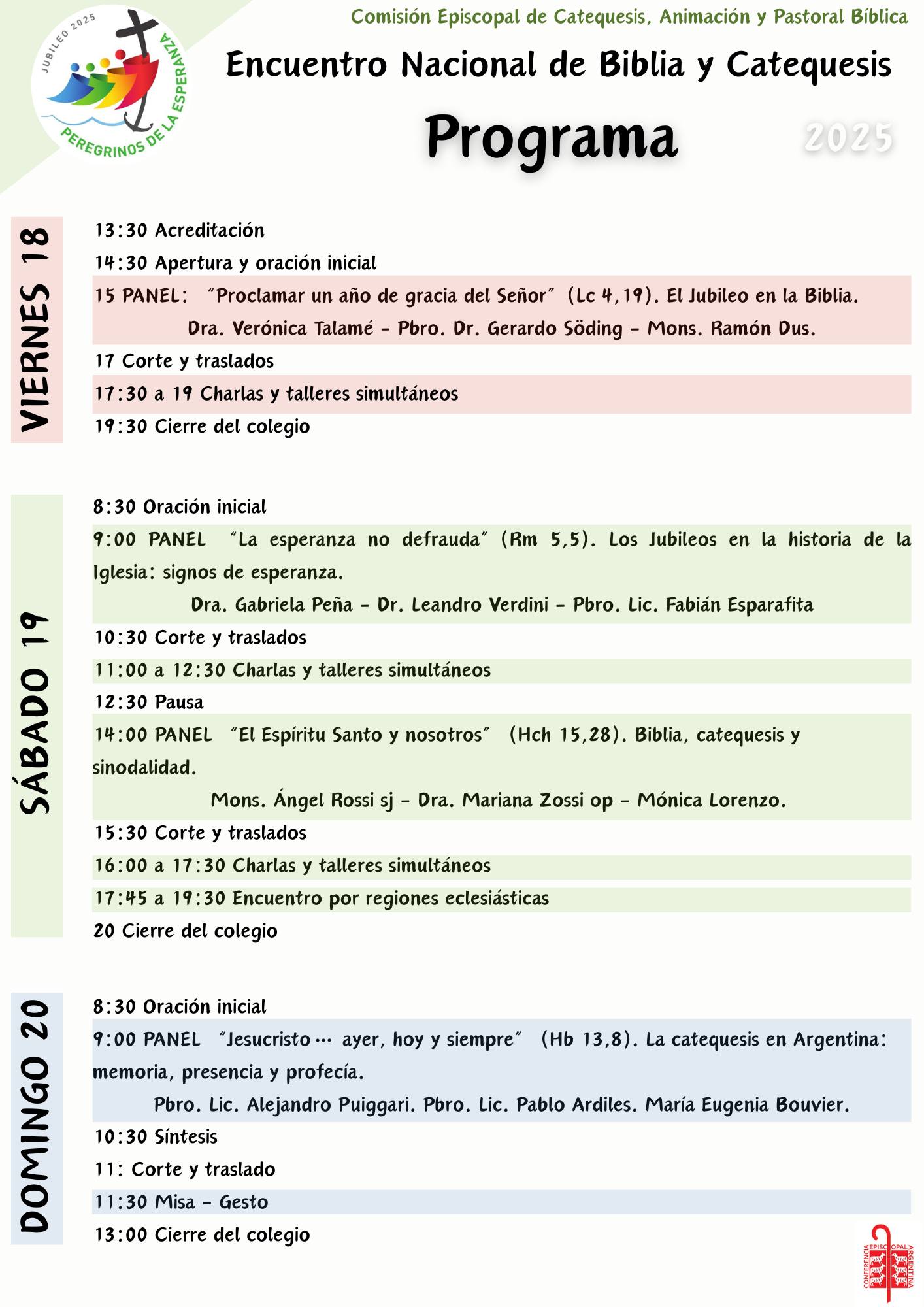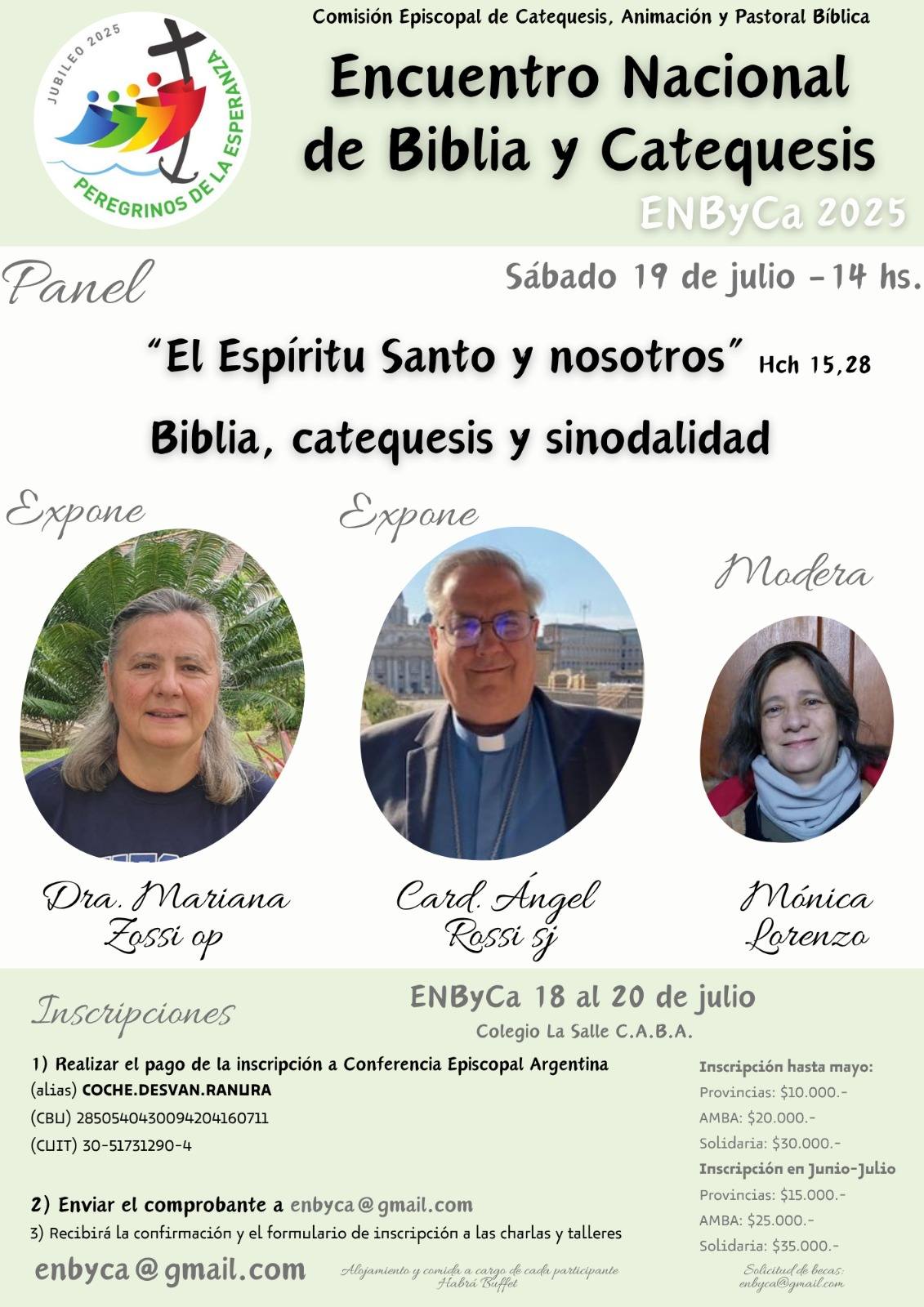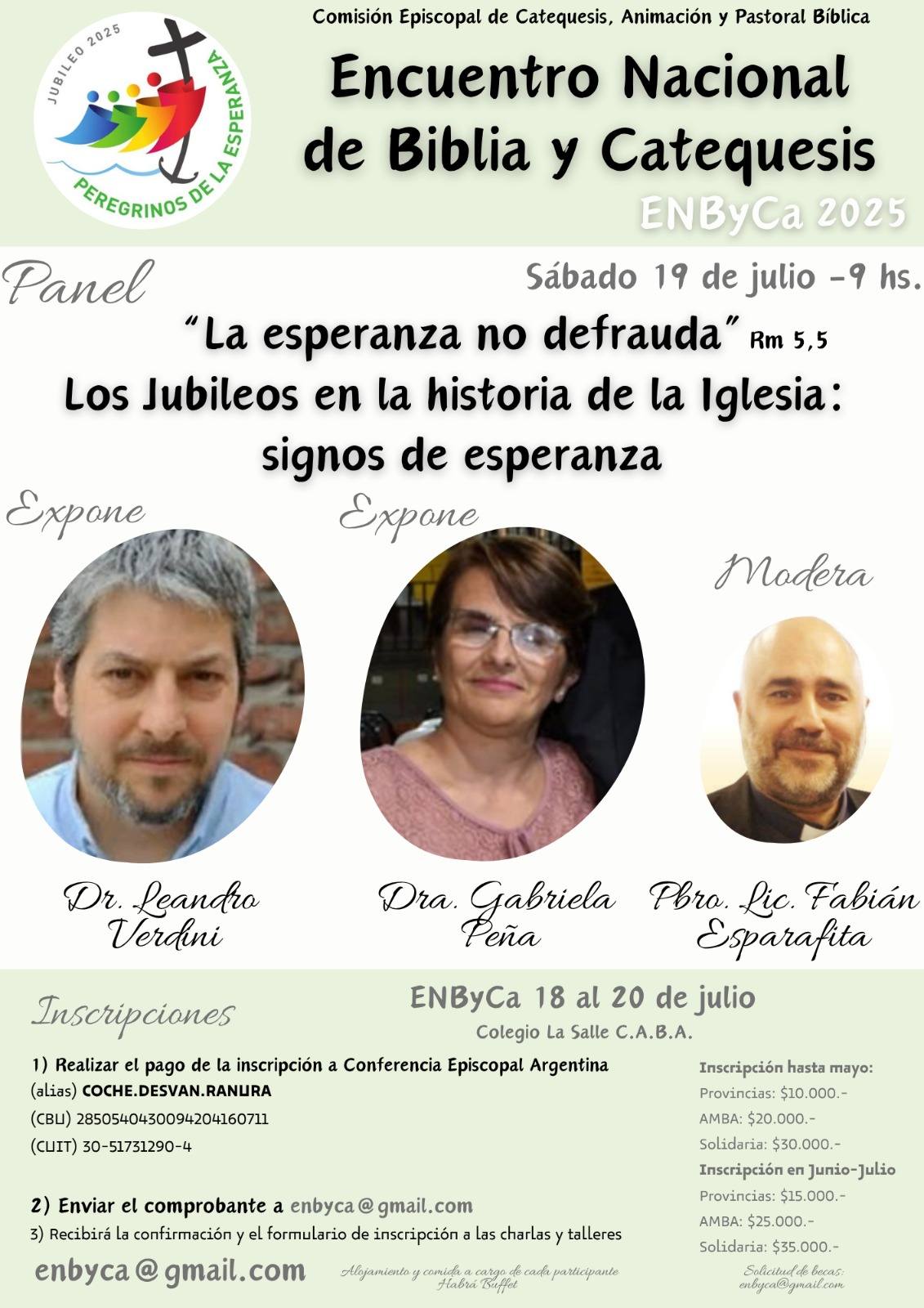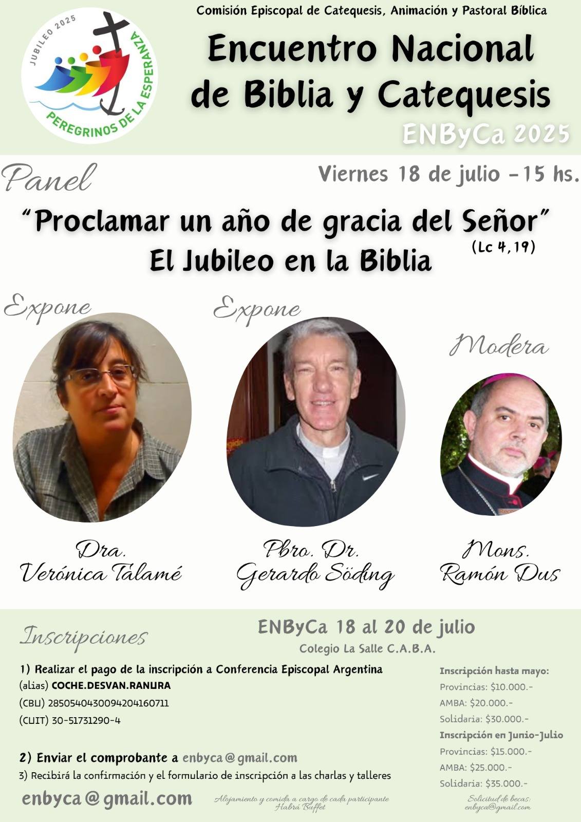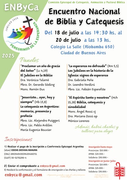La Comisión Episcopal de Catequesis, Animación y Pastoral Bíblica invitan con motivo del Jubileo 2025 al Encuentro Nacional de Biblia y Catequesis #ENByCa2025, Del 18 al 20 de Julio en el Colegio La Salle, Riobamba 650 C.A.B.A