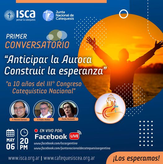 La Junta Nacional de Catequesis y el ISCA, te invitan a participar del Primer Conversatorio: “Anticipar la Aurora Construir la Esperanza”, a 10 años del III Congreso Catequístico Nacional”, el día Viernes 6 de mayo a las 20 hs. a cargo de P. Marcelo Carraza, P. Pablo Ardiles y Pocha Martinelli. ¡Los esperamos!