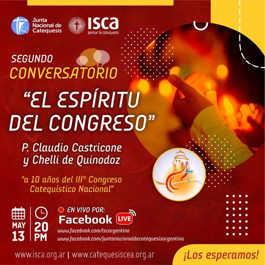 La Junta Nacional de Catequesis y el ISCA, te invitan a participar del Segundo Conversatorio: “El Espíritu del Congreso”, a 10 años del III Congreso Catequístico Nacional”, el día Viernes 13 de mayo a las 20 hs. a cargo del P. Claudio Castricone y Chelli de Quinodoz. ¡Los esperamos!