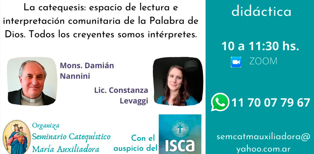 PROFUNDIZANDO NUESTRA FECapacitación para catequistas y agentes de pastoral con formación previa. Sábado 10 Abril: La Biblia: ¿Todos los libros y textos son iguales? ¿Cuáles leer en catequesis? Sábado 17 Abril: La catequesis: espacio de lectura e interpretación comunitaria de la Palabra de Dios. Todos los creyentes somos intérpretes. Consulta e Informes: 1170077967 / semcatmauxiliadora@yahoo.com.ar