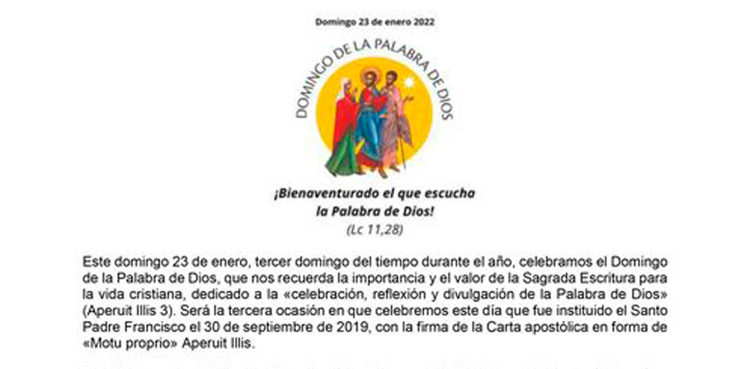 Leer másEl 23 de enero próximo, Domingo III durante el año, tendrá lugar la celebración del Domingo de la Palabra de Dios. El Departamento Nacional de Animación y Pastoral Bíblica de la Comisión Episcopal De Catequesis y Pastoral Bíblica de la Conferencia Episcopal Argentina, elaboró un Guión para la Celebración Eucarística. Link para descargar el Guion…